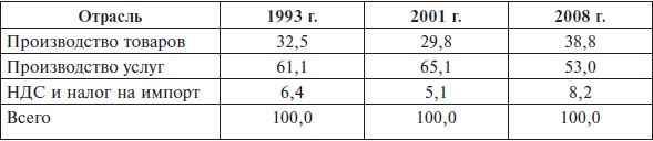 Главным макроэкономическим результатом в период 2003–2008 гг. стало не только прекращение падения, но существенное увеличение доли товарного производства в структуре ВВП, иными словами, имел место процесс, противоположный тому, что происходило в 1990-е гг., когда неуклонно возрастал удельный вес сектора услуг (см. табл. 12.9). С нашей точки зрения, последовательное и взвешенное проведение в жизнь выбранного курса способно оздоровить и модернизировать экономику, провести ее реиндустрилизацию и подготовить переход на более высокую, инновационную ступень развития.