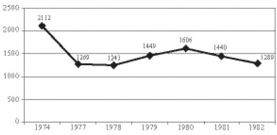В другом положении оказались миллионы работавших по найму, и в первую очередь промышленные рабочие. Их материальная ситуация стала ухудшаться, поскольку другим ключевым моментом политики "Процесса" был курс на снижение доли наемных работников в национальном доходе. С этой целью военный режим распустил ВКТ, запретил проводить забастовки и другие акции протеста, внес антирабочие изменения в трудовое законодательство и периодически замораживал заработную плату. Физическое устранение особенно несговорчивых профсоюзных лидеров дополняло картину политики в отношении трудящихся. Однако наибольший ущерб материальным интересам граждан, работавших по найму, нанесла проводимая неолибералами, состоявшими на службе военной диктатуры, фактическая деиндустриализация страны, т. е. разрушение местного промышленного потенциала (в первую очередь в результате усилившейся иностранной конкуренции), что неумолимо вело к сохранению реальной заработной платы на относительно низком уровне (см. рис. 2.1).