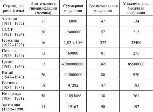 Таблица 3.5 Периоды гиперинфляции в Аргентине и некоторых других странах мира (в %)