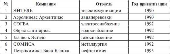 В период 1990–1999 гг. в Аргентине было приватизировано около 110 крупных госкомпаний и передано в частные руки свыше 40 концессий. Общий размер финансовых средств, полученных государством, измерялся цифрой порядка 30 млрд дол., из которых 20 млрд были получены наличными, а 10 млрд – в виде ценных бумаг и аргентинских суверенных долговых обязательств, так называемые операции "долги за активы " (debl-for-equity-swaps). Иногда исследователи приводят немного иные цифры, но они не меняют общей картины: аргентинская приватизация носила масштабный характер, была проведена в исторически сжатые сроки и с технической точки зрения отличалась сравнительно высокой степенью организации. Курс на денационализацию экономики на определенном этапе стал важным инструментом финансирования бюджетного дефицита. Вместе с тем в целом ряде случаев (как, например, с ЭНТЕЛЬ) государственные активы приобретались приватизаторами по ценам значительно ниже рыночных, что нередко использовалось противниками К. Менема для политических атак на его правительство. Власти сознательно шли на такого рода издержки, рассчитывая в конечном счете укрепить конкурентные (рыночные) начала экономики. В Розовом доме считали, что главное состояло в том, чтобы на месте убыточных госмонополий создать конкурирующие между собой высокорентабельные частные фирмы и таким образом повысить эффективность производства товаров и услуг. При этом отраслевая направленность приватизационного процесса, вполне естественно, детерминировалась структурой госсектора, в котором главный удельный вес приходился на компании, предоставлявшие коммунальные услуги (телефонная связь, газ, электричество, водоснабжение), а также банковские учреждения и транспорт. Все они были приватизированы в 1990–1999 гг. (см. табл. 4.1). Кроме того, под паровой каток приватизации попали металлургические предприятия, тепловые и гидроэлектростанции, страховые общества, морские и речные порты, фирмы, обслуживающие внешнеторговые операции (погрузка-разгрузка грузов и т. д.), судостроительные верфи.