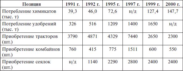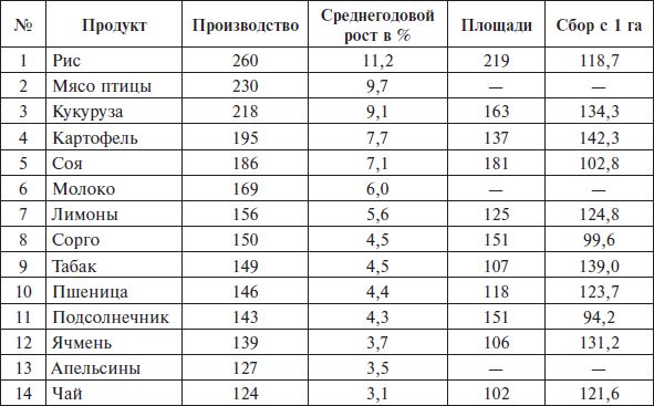 Таблица 5.1 показывает, что в период 1990–1999 гг. имело место существенное увеличение объемов производства и повышение продуктивности сельского хозяйства. В целом ряде случаев (рис, мясо птицы, кукуруза, картофель, соя, молоко, цитрусовые) это увеличение составило от 56 до 160 %, что свидетельствовало об усилении моторных функций аграрного сектора.