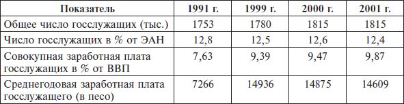 Критики правительства утверждали, что в Аргентине в конце 1990-х гг. было примерно такое же количество госслужащих (порядка 1,8 млн человек), как и в США, при соотношении численности населения двух стран 1:8270. При всей сомнительности такого утверждения бесспорно одно: в результате рыночных реформ ощутимого сокращения "бюрократического навеса" над аргентинским обществом не произошло. Данные табл. 7.3 показывают увеличение вдвое средней заработной платы госслужащих и повышение на 30 % удельного веса их совокупных официальных вознаграждений в национальном ВВП.