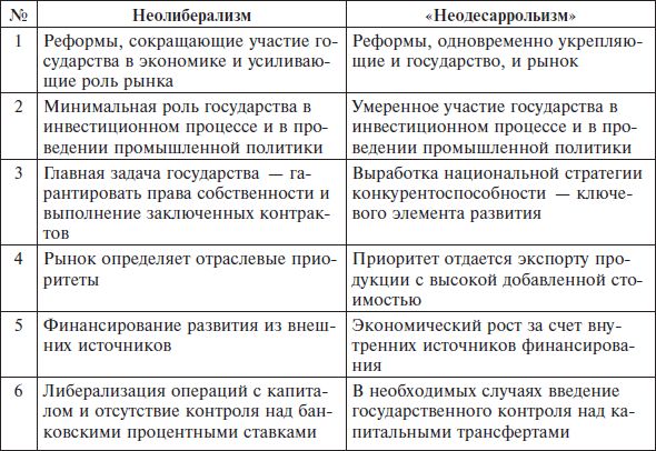 "Новый десаррольизм – это не просто экономическая теория, но и стратегия национального развития", – подчеркивал бывший министр финансов Бразилии Луис Карлос Брессер-Перейра402. Сравнивая "неодесаррольизм" с классическим десаррольизмом 1950-1960-х гг., автор отметил следующее. При всем идейном и принципиальном сходстве в современных условиях десаррольисты значительно больше внимания уделяют эффективности и финансовой состоятельности государства (отсюда – стремление аргентинских властей к сохранению бюджетного профицита и активного внешнеторгового сальдо). Кроме того, нынешние сторонники десаррольистской теории проявляют определенную гибкость и избирательность в проведении промышленной политики. В частности, они на практике отошли от присущей их предшественникам тотальной поддержки национального производителя, заменив его избирательным подходом, сильный акцент делают на повышение конкурентоспособности и, что очень важно, расширении экспорта продукции глубокой переработки (в отличие от "экспортного пессимизма" прежних лет). Но, разумеется, главные концептуальные различия пролегают между "неодесаррольизмом" и неолиберализмом. (Для большей наглядности попробуем их выразить в виде табл. 9.4.)