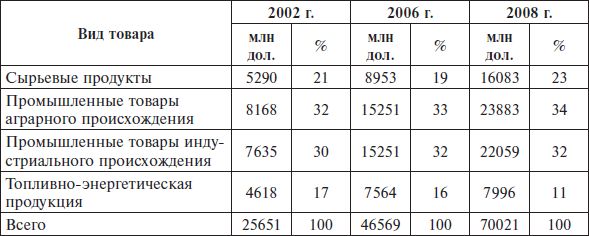 Агрегированные данные в табл. 11.4 показывают, что основу аргентинского экспорта составляют промышленные товары аграрного и индустриального происхождения, на долю которых приходится 62–66 % общего объема экспортных поставок. Заметную роль продолжают играть сырьевые товары (19–22 %), а доля топливно-энергетической продукции, несмотря на значительное повышение международных цен, ощутимо снизилась: с 17 % в 2002 г. до 12 % в 2008 г. С точки зрения внешнеэкономической специшшзации Аргентину можно характеризовать как преимущественного экспортера промышленной продукции, большая часть которой является результатом переработки сельскохозяйственного сырья.