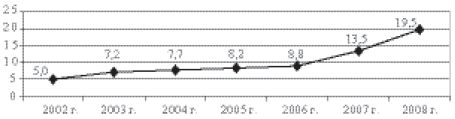 Ведущая роль в продовольственном сегменте прочно принадлежит соевому комплексу , основные продукты которого (соевые бобы, масло, мука, шрот) стали внешнеторговым брендом Аргентины. Соевый комплекс оказался самым динамичным и конкурентоспособным в мире: в 2003–2007 гг. он удовлетворил 95 % мирового прироста спроса на соевую муку и 100 % – соевого масла. На долю Аргентины стало приходиться 49 % мирового экспорта первого продукта и 59 % второго 492. Подчеркивая значение экспорта соепродуктов для аргентинской экономики, а значит, и политики, мадридская газета "Эль Пайс" писала: "Соя для четы Киршнер – это то же самое, что для Чавеса нефть…"493 В период 2002–2008 гг. вывоз продуктов сои вырос с 5 до 19,5 млрд дол. (см. рис. 11.2), и они действительно стали "звездной позицией" аргентинского экспорта, составив в разные годы от 19 до 28 % всего объема внешних товарных поставок. В аргентинской и мировой печати появились материалы о "соезации" страны, замелькали характеристики Аргентины как "соевой республики". При этом производство продуктов сои носит классический кластерный характер: 73 % мощностей по промышленной переработке сосредоточены в районе вокруг города Росарио, в провинции Санта-Фе. Из порта Росарио на реке Парана на внешние рынки (более чем в сто стран мира) вывозится порядка 96 % соевого масла, муки и шрота494.