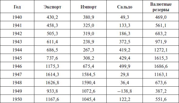 Данные показывают, что в целом экономические итоги Второй мировой войны и первых послевоенных лет были для Аргентины благоприятны. В частности, в 1948 г. был достигнут рекордный уровень экспорта – 1 626,8 млн дол., который удалось превзойти лишь в 1970 г., т. е. через 22 (!) года. Страна не только полностью расплатилась по внешним долгам, но впервые в своей истории превратилась из "закоренелого" должника в международного кредитора. Любопытно в этой связи, что, по мнению ряда исследователей, отмена в августе 1947 г. британским правительством свободной конвертируемости фунта стерлингов на деле означала дефолт по накопившимся за военные годы долгам Лондона Буэнос-Айресу51.
