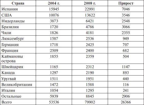Целенаправленные усилия Буэнос-Айрес приложил к нормализации связей с бизнес-сообществом Испании. Правительству Н. Киршнера в целом удалось восстановить климат доверия в аргентино-испанских деловых отношениях, серьезно пострадавший в период кризиса 2001–2002 гг. В контексте укрепления международно-политического сотрудничества двух стран и под влиянием успехов Аргентины в развитии национальной экономики предпринимательские круги Испании возобновили крупномасштабные операции на аргентинском рынке. Показательно, что испанские компании и банки сохранили за собой первое место по объемам прямых капиталовложений (см. табл. 12.2). Как отмечал в этой связи президент Испанской торговой палаты в Аргентинской Республике Гильермо Амброхи, рост аргентинской экономики на 9 % в год "создает такие инвестиционные возможности, которые никто не желает упускать"548.