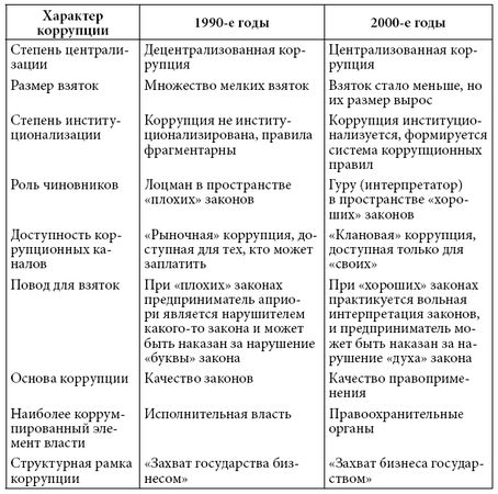В 2000-е годы ситуация изменилась. Законы стали "хорошими", они взаимоувязаны, в них меньше "дыр". Бизнес вполне может обойтись без помощи чиновника, работая в соответствии с законом. В этой ситуации чиновники начали торговать не "буквой", но "духом" закона, взяв на себя роль интерпретаторов законов с позиций национальных интересов. Чиновник сменил роль лоцмана в пространстве "плохих" законов на роль гуру в условиях "хорошего" законодательства. И теперь, чтобы получить государственный заказ или просто спасти бизнес от государственного поглощения, недостаточно быть законопослушным бизнесменом, нужно быть "на хорошем счету" у власти. Бизнес, понимая ненадежность формальной защиты прав собственности, пытается заручиться поддержкой власти, используя коррупционные схемы.
