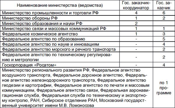 Таблица 2.1. Закрепление ФЦП по направлению "Развитие высоких технологий" за министерствами и ведомствами РФ