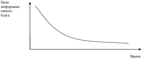 В основе развития и распространения информационных технологий лежит закон Г. Мура, открытый им в 1965 г., согласно которому мощность микропроцессоров удваивается каждые 18 месяцев. При этом постоянно происходит снижение цен на компьютеры, сокращаются коммуникационные издержки, растет число пользователей Сети, вследствие чего объективно уменьшается стоимость средств информатизации и, соответственно, снижаются затраты на получение и обработку информации. Эта закономерность описывается "кривой Гильдера" (рис. 1.1), которая показывает, что цена единицы информационного блага для производителя со временем становится такой низкой, что стоимость ее потребления стремится к нулю, но никогда его не достигнет, поскольку есть определенные минимальные затраты на производство данного блага.
