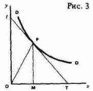 Когда РТ вдвое больше Pt, снижение цены на 1% вызовет увеличение объема спроса на 2%; эластичность спроса будет равна 2. Если РТ составит 1/3 Pt, снижение цены на 1% вызовет увеличение спроса на 1/3; эластичность спроса будет равна 1/3, и т. д. Иной подход к характеристике того же результата таков: эластичность в точке Р измеряется отношением РТ к Pt, т.е. МТ к МО (РМ - прямая, перпендикулярная МО); следовательно,эластичность равна 1, когда угол ТРМ равен углу ОРМ; она всегда возрастает, когда угол ТРМ увеличивается относительно угла ОРМ, и наоборот. См. Замечание III в Математическом приложении].