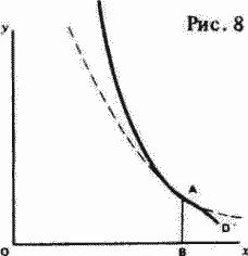 § 4. Исключение составляют предметы первой необходимости. Когда цена на пшеницу очень высока и когда она очень низка, спрос на нее весьма мало эластичен, во всяком случае, если учесть то обстоятельство, что пшеница, даже когда ее мало, является самой дешевой пищей для человека и что, даже когда она имеется в изобилии, ее не потребляют иначе как в виде пищи. Известно, что снижение цены буханки хлеба с 6 пенсов до 4 пенсов едва ли вызывает увеличение потребления хлеба. Относительно другого края шкалы гораздо труднее говорить столь определенно, так как со времени отмены хлебных законов в Англии не было сколько-нибудь ощутимого недостатка хлеба. Но если вспомнить опыт менее благополучных времен, можно предположить, что сокращение предложения на 1, 2, 3, 4 или 5 десятых вызовет повышение цен на 3, 8, 16, 28 или 45 десятых соответственно. [Этот расчет обычно приписывают Грегори Кингу. Его воздействие на закон спроса блестяще описано лордом Лодердейлом ("An Inquiry into the Nature and Origin of Public Wealth, and into the Means and Causes of its Increase". Edinburg and London, 1804, P. 51-53). Это воздействие показано на рис. 8 кривой DD', на которой точка А соответствует обычной цене. Если принять во внимание тот факт, что там, где цена на пшеницу очень низка, ее могут употреблять, как это, например, имело место в 1834 г., на корм крупному рогатому скоту, овцам и свиньям, а также в пивоварении и винокурении, нижняя часть кривой примет форму, несколько сходную с такой же частью пунктирной линии на рис. 8.