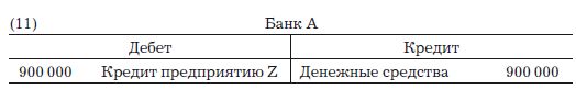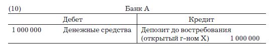 Эти ожидания особенно сильны, поскольку в обычных обстоятельствах маловероятно, что клиенты попытаются изъять суммы, превышающие размер страхового фонда, или коэффициента резервирования. Казалось бы, опыт показывает, что это так, и доверие, заслуженное банком годами надлежащего сохранения клиентских вкладов, увеличивает неправдоподобность столь неприятной ситуации, как и тот факт, что изъятие средств очень часто замещается новыми вкладами. Если мы предположим, что банкир рассматривает 10 %-ный страховой резерв (также называемый коэффициентом резервирования) достаточным, чтобы удовлетворить возможные требования по изъятию вкладов, то остальные 90 % вкладов до востребования, т. е. 900 000 д.е., будут доступны для его использования к собственной выгоде. Используя европейскую бухгалтерскую систему, это экономическое событие можно представить следующим образом: когда г-н Х делает вклад до востребования, бухгалтерские проводки идентичны показанным под номером 7, хотя на этот раз имеется в виду не забалансовый счет.