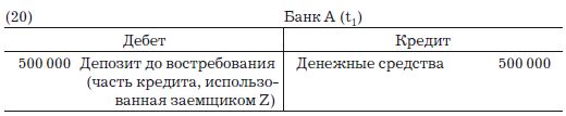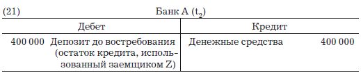 Вернемся к нашему примеру. По мере того как заемщик Z постепенно использует деньги, выписывая чеки на счет, открытый для него банком, способы отражения операций в бухгалтерских книгах в двух банковских системах, англосаксонской и континентальной, начнут сближаться. Предположим, что заемщик снимает со счета полученный кредит двумя частями, каждая из которых составляет отдельное событие. В первый раз (t1) он расходует 500 000 д.е., во второй (t2) – 400 000 д.е. Бухгалтерские записи будут следующими: