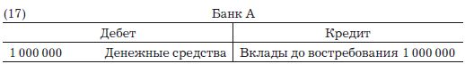 Различие между англосаксонской и континентальной системами пролегает в бухгалтерской записи, которую англоязычный банкир делает после решения предоставить кредит предприятию Z и, следовательно, использовать в своих интересах 900 000 д.е., лежащие в банковских хранилищах сверх страхового резерва. В англосаксонской банковской практике проводка делается, чтобы записать эту ссуду в активы, и в то же время в разделе пассивов открывается текущий счет заемщика на сумму, равную ссуде (900 000 д.е.). Проводка выглядит так:
