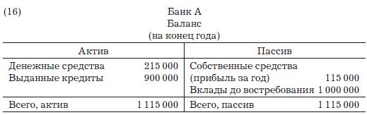 На самом деле банковская прибыль 115 000 д.е. более чем вдвое превышает законную прибыль, которую он мог бы извлечь из финансового посредничества между заимодавцами и заемщиками, и более чем в десять раз – ту, которую он имел бы, получая от клиентов оплату за расчетно-кассовые услуги.