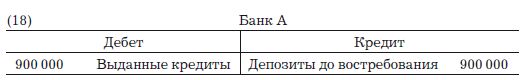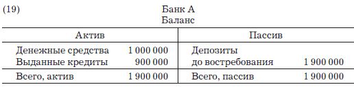 Этот баланс ясно показывает, что в тот момент, когда банк выдает кредит в размере 900 000 д.е., он одновременно создает депозиты из ничего на сумму в 900 000 д.е. Иными словами, банк предоставляет в распоряжение заемщика до 900 000 д.е., что увеличивает баланс депозитов до востребования до 1 900 000 д.е. Из этой суммы 1 000 000 д.е. соответствуют физическим денежным единицам, т. е. первичному депозиту. Остальные 900 000 д.е. отражают фидуциарные средства, созданные из ничего, – иначе говоря, производный, или вторичный, депозит.