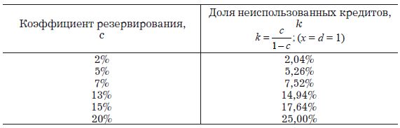 Для наглядности мы составили следующую таблицу различных сочетаний c (коэффициента резервирования) и k (процента неиспользованных кредитов или клиентов одного и того же банка), которые позволяют изолированному банку в одиночку удваивать свою денежную массу (подставляя эти значения в формулу [3], получаем x = d).