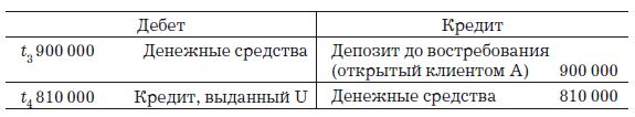 Предположим, что U полностью использует полученный кредит и платит своему кредитору А. Являясь клиентом того же банка, что и U, А размещает полученные 900 000 д.е. на депозите в этом банке. В результате получаются следующие записи: