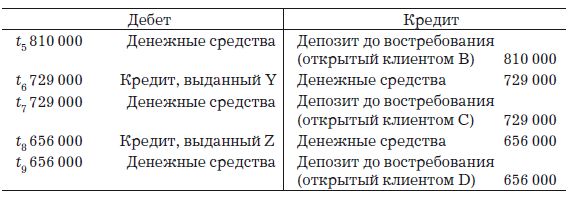 Мы будем следовать традиционной континентальной системе (противоположной англосаксонской), в которой все платежи отражаются на счете денежных средств. Нижеследующий пример представляет журнал на моменты времени t1, t2, t3… t9 и т. д. и отражает практику банка в каждой итерации предоставлять своим клиентам кредиты на сумму, равную 90 % получаемых банком денежных средств. Клиенты используют полученные кредиты полностью, но ввиду отсутствия у них счетов в других банках (или попросту из-за того, что другого банка в этом обществе нет), в конечном счете полученные ими деньги возвращаются в тот же банк. Это, в свою очередь, позволяет банку предоставлять новые кредиты и генерировать новые депозиты, причем процесс повторяется вновь и вновь: