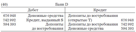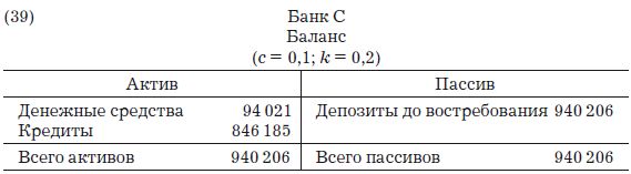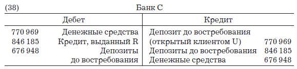 Последнюю запись банк С сделал, когда R изъял 80 % (k = 0,2) своего кредита, полученного от банка С, чтобы заплатить, например, кредитору Т. Как только эти операции будут выполнены, баланс банка С приобретет следующий вид.