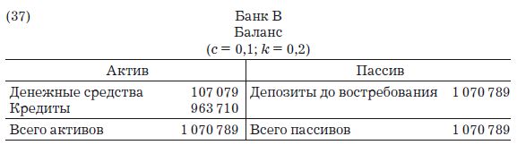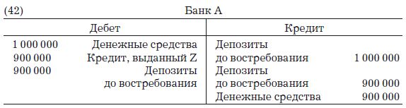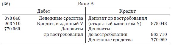 Предположим, что когда Z изымает свой депозит, от платит Y, клиенту банка В, который открывает депозит в этом банке. Последуют три проводки, параллельно трем вышеприведенным. Для определения объемов снова используется формула [3].