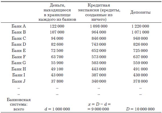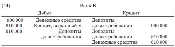 Располагая в своих хранилищах первичными депозитами в размере всего 1 000 000 д.е., банк А, занимающий монопольное положение, расширил кредит путем предоставления кредитов на сумму 9 000 000 д.е., в покрытие которых создав из ничего новых депозитов, или фидуциарных средств обращения, на сумму 9 000 000 д.е.
