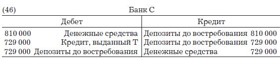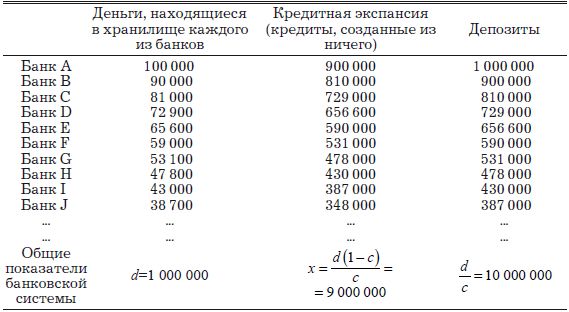 В свете того факта, что в данном контексте мы вынуждены предложить упрощенный взгляд на процесс кредитной экспансии, необходимо отметить несколько дополнительных моментов, а также сделать некоторые пояснения. Начнем с того, что описанные нами процессы экспансии целиком и полностью возникают исключительно в результате увеличения количества денег, внесенных на вклад в начальном банке (в нашем примере d представляет 1 000 000 д.е., депонированных в банке А). Однако и исторически, по мере развития банков, и в настоящее время все процессы кредитной экспансии характеризуются тем, что новые деньги вливаются в банковскую систему не через один-единственный банк, а через множество банков (а то и в той или иной степени через все банки системы). Как показывает Ричард Липси, кредитная экспансия, подобная описанной нами – происходящая ex nihilo и поддерживаемая созданием необходимых банковских депозитов, – будет повторяться всякий раз, когда в любом из банков будет делаться вклад в размере 1 000 000 д.е. Поэтому общий процесс экспансии на деле является более существенным по масштабам и качественно более сложным, так как он происходит одновременно во многих банках и от множества депозитов. В нашем единственном примере с коэффициентом резервирования 10 % в итоге были созданы кредиты на сумму 9 000 000 д.е., что в девять раз превышает начальный депозит, и в результате денежное предложение увеличивается в 10 раз. Главный вывод, который отсюда следует, состоит в том, что если все банки одновременно получат новые денежные депозиты, они смогут расширить кредит без уменьшения своих денежных резервов, потому что, предоставляя кредиты, ведущие к изъятию денег (как мы до сих пор предполагали в наших бухгалтерских записях), они одновременно получают депозит в виде части денег, предоставленных в виде кредитов другими банками. Следовательно, на деле вовсе не обязательно происходит значительное сокращение резервов каждого из банков, и каждый банк, поддерживая свои резервы практически в неприкосновенности, будет способен выдавать кредиты и соответственно создавать депозиты, без особого риска.