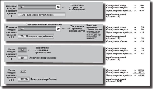 Однако вспомним теперь, что сектор потребления занимает лишь относительно малую часть полной производственной структуры общества и суммы денежных единиц, потраченные на конечное потребление, составляют лишь часть стоимости валового национального продукта, производимого на всех стадиях производственного процесса. Поэтому бухгалтерские убытки последних стадий не оказывают немедленного влияния на стадии, предшествующие потреблению, где разница между доходами и расходами все еще остается положительной – разница, подобная той, что существовала перед увеличением сбережений. Лишь после продолжительного периода времени депрессивный эффект, вызванный на конечной стадии (стадии производства потребительских благ) ростом сбережений, начнет ощущаться на стадиях, ближайших к нему, и негативное влияние будет все больше и больше ослабевать по мере удаления от стадий, близких к конечному потреблению. В любом случае бухгалтерская прибыль на самых далеких от потребления стадиях в тенденции будет оставаться постоянной, как показывает пятая стадия в период времени t на рис. 5–2. Здесь мы наблюдаем, что на этой стадии деятельность продолжает приносить бухгалтерскую прибыль 11 % – разница между общим доходом в 20 д.е. и общими затратами в 18 д.е. Следовательно, увеличение сбережений очевидным образом приводит к огромному несоответствию между бухгалтерскими прибылями компаний первой стадии – стадии потребительских благ – и прибылями, которые зарабатывают компании на стадиях, наиболее отдаленных от конечного потребления (пятая стадия нашего примера производственной структуры). В секторе потребительских благ бухгалтерские убытки возникают из роста сбережений, и в то же время отрасли наиболее далекой от потребления пятой стадии (т. е. произведенные ею потребительские блага будут доступны только спустя пять лет) продолжают получать прибыль, примерно равную 11 % инвестированного капитала (текущее сокращение потребления не оказывает влияния на потребление через пять лет).