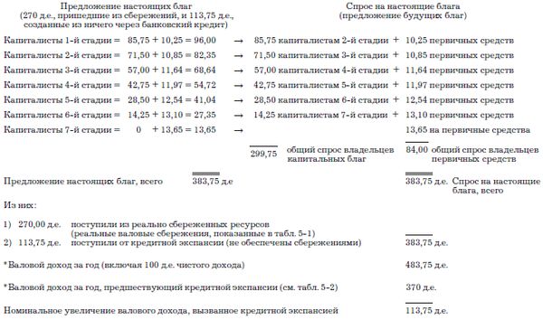 Табл. 5–5 отражает спрос и предложение настоящих благ, складывающиеся под влиянием банковской кредитной экспансии, не обеспеченной сбережениями. Мы видим, что предложение настоящих благ увеличилось с 270 д.е., показанных в табл. 5–1, до чуть более 380 д.е., которые, в свою очередь, состоят из 270 д.е. из прошлого примера (происходящих из реально сбереженных ресурсов), плюс более 113 д.е., созданных банками путем кредитной экспансии без обеспечения сбережениями. Таким образом, кредитная экспансия искусственно повышает предложение настоящих благ, спрос на которые при более низкой процентной ставке предъявляют владельцы первичных средств производства и капиталисты на более ранних стадиях, более далеких от потребления. Кроме того, табл. 5–5 показывает, что валовой доход за год составил более 483 д.е., т. е. стал на 113 д.е. больше валового дохода за год, предшествующий кредитной экспансии (см. табл. 5–2).