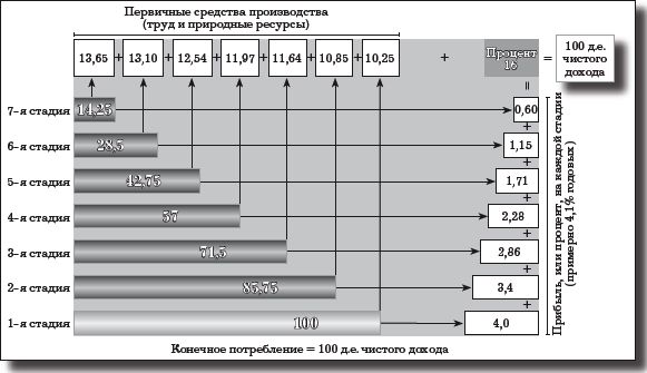 На рис. 5–5 представлена упрощенная иллюстрация воздействия, оказываемого на структуру производственных стадий банковской кредитной экспансией, не подкрепленной необходимым увеличением общественных сбережений. При сравнении рис. 5–5 с рис. 5–1 видно, что конечное потребление остается неизменным и составляет 100 д.е., соответствуя нашему предположению о том, что чистые сбережения не увеличиваются. Несмотря на это посредством кредитной экспансии создаются и направляются в систему новые деньги (депозиты или фидуциарные средства обращения), для чего производится относительное снижение процентной ставки (как правило на фоне облегчения контрактных условий и требований к получателям кредитов), поскольку иначе трудно убедить экономических агентов взять вновь созданные кредиты. Соответственно норма прибыли на различных производственных стадиях, которая, как нам известно, тяготеет к совпадению с процентной ставкой, устанавливающейся на каждой из стадий посредством предоставления настоящих благ в обмен на будущие блага, теперь падает с 11 %, показанных на рис. 5–1, до чуть выше 4 % годовых. Более того, новые кредиты позволяют предпринимателям каждой производственной стадии платить больше за соответствующие первичные средства производства, а также за капитальные блага, производимые на более ранних стадиях, которые эти предприниматели получают для своего собственного процесса производства.