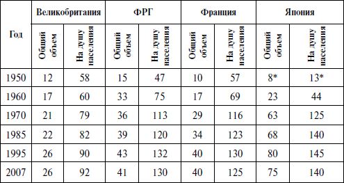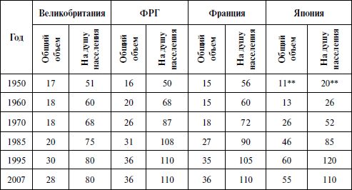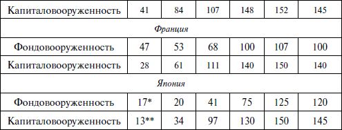 Так, в расчете на душу населения накопленный основной производственный капитал по отношению к уровню США возрос с 1950 по 2007 г. в Великобритании с 51 до 80 %, в ФРГ – с 50 до 110, во Франции – с 56 до 110, в Японии – с 20 (1955 г.) до 110 %.