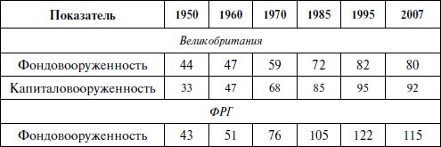 Расчеты показывают, что фондовооруженность труда (величина основного производственного капитала в расчете на одного занятого) в Великобритании по отношению к уровню США возросла в 1950–2007 гг. с 44 до 80 %, в ФРГ – с 43 до 115, во Франции – с 47 до 100, в Японии – с 17 (1955 г.) до 120 %. Еще более динамичны сдвиги в соотношениях по капиталовооруженности труда (величина капиталовложений в народное хозяйство на одного занятого): уровень Великобритании по отношению к США возрос с 33 до 92 %, ФРГ – с 41 до 145, Франции – с 28 до 140, Японии – с 13 (1951 г.) до 145 %. Таким образом, ФРГ, Франция и Япония уже значительно опередили США по капиталовооруженности труда.