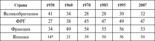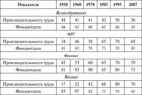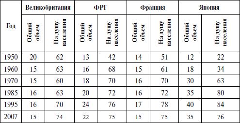 В расчете на душу населения соотношение ВВП западноевропейских стран к уровню США повысилось за период с 1950 по 2007 г. для ФРГ – с 42 до 75 %, Франции – с 51 до 75, Японии – с 22 до 76, Великобритании – с 62 до 74 %.