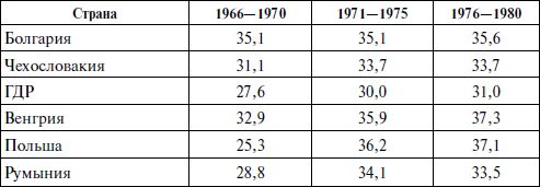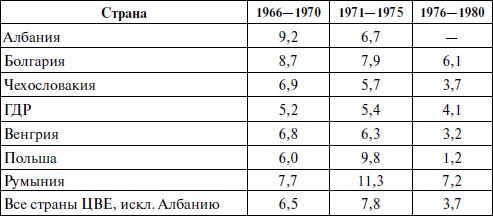 Наибольшее замедление темпов роста имело место в Польше, затем в Венгрии, наименьшее – в Румынии, но в целом среднегодовой прирост национального дохода во всей группе рассматриваемых стран снизился почти вдвое: с 6,5 % в 1966–1970 гг. до 3,7 % в 1976–1980 гг.