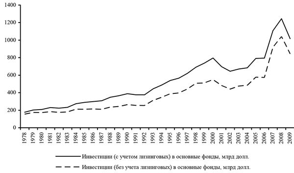 Динамика лизинга оборудования и инвестиций в оборудование в США в 1978–2009 гг.