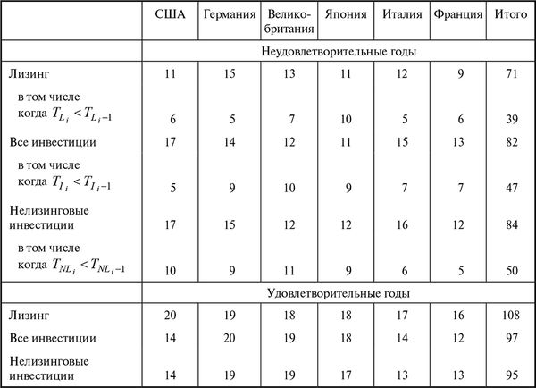 Как видно из табл. 1.8, по совокупным показателям шести стран подверженность лизинга кризисным, предкризисным и неблагоприятным явлениям оказалась несколько ниже, чем в целом для всей инвестиционной деятельности. Каждому неудовлетворительному лизинговому году соответствовали 1,5 удовлетворительных года. Мы исходим из того, что удовлетворительные и неудовлетворительные годы отражают текущие колебания в рамках более продолжительных волнообразных циклов. Причем один лизинговый цикл содержит 2–3 колебания, и экстремальные точки отдельных из них могут являться пограничными для всего цикла и сформировать амплитуду всей волны.