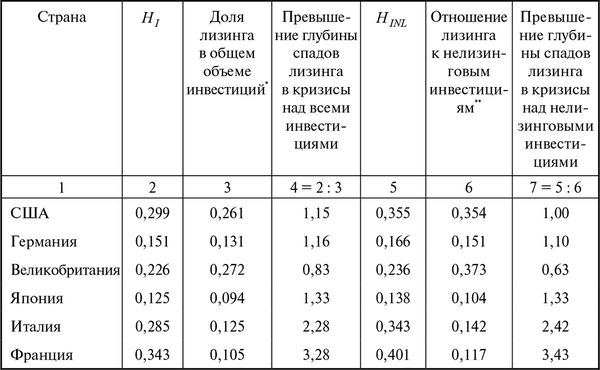 Как видно из табл. 1.9, в большинстве стран глубина спада лизинга при понижающемся тренде была выше, чем спад по всем инвестициям. В Великобритании иная картина – лизинг оказался более устойчивым к кризисным явлениям и сократился под натиском кризиса в меньшей степени. Почти та же ситуация имела место при сравнении спадов для лизинга и для нелизинговых инвестиций. Отличие только в том, что в США наблюдалось почти равенство показателей при оценке спада.