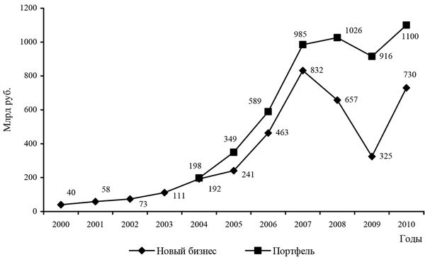 Соотношение портфеля и новых договоров лизинга в 2004–2010 гг.