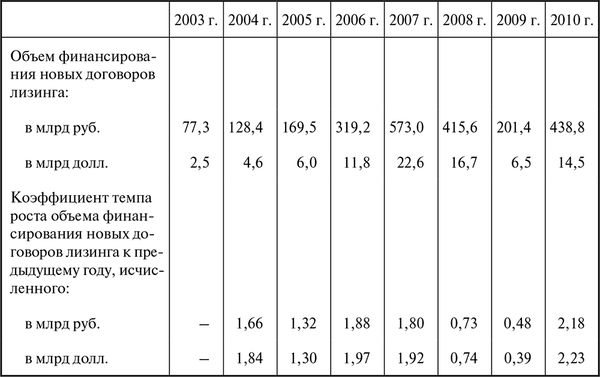 Объемы и динамика финансирования новых договоров лизинга в Российской Федерации в 2003–2010 гг.