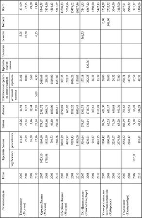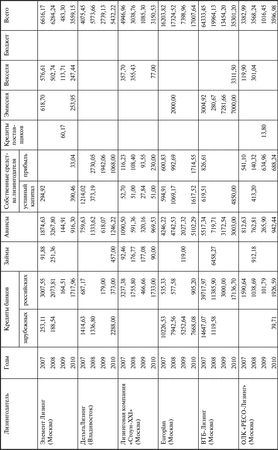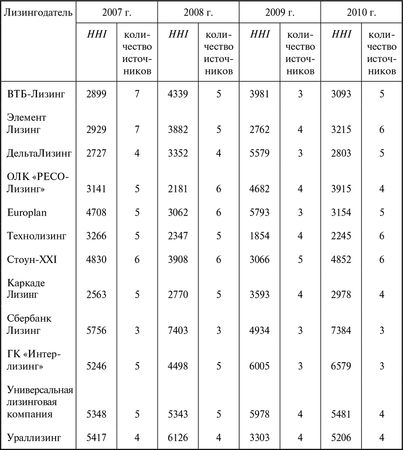 Для освоения навыка расчета индекса HHIfin можно рассмотреть, как изменялась ситуация с показателем концентрации финансирования по отдельным лизинговым компаниям. В табл. 2.6 представлена информация за 2007–2010 гг. по 12 российским лизингодателям, разным по величине, правовой и экономической соподчиненности, которые для реализации лизинговых проектов использовали от трех до семи источников финансирования. Даже чисто визуально можно определить, что наиболее насыщенными, помимо итогов, являются те столбцы таблицы, где приведены данные по авансам, кредитам российских банков, прибыли лизингодателей. Читателям могу предложить самостоятельно провести соответствующие расчеты, определить величину индекса и сравнить с полученными нами результатами, которые отражены в табл. 2.5.