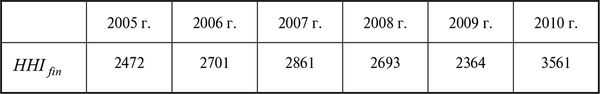 Расчеты индекса HHIfin показали, что в благоприятные годы (т. е. до кризиса) имел место рост концентрации финансирования. Происходило это, прежде всего, за счет роста банковского кредитования. С началом проявления негативных тенденций и позже, с наступлением непосредственно кризиса, стали активнее использоваться иные направления фондирования лизинга. Причем пока не было достигнуто дно кризиса в середине 2009 г. эта тенденция не прекращалась. Затем начался медленный, а вскоре убыстряющийся рост объемов нового бизнеса на рынке лизинговых услуг, который сопровождался притоком в отрасль банковских кредитов. В результате уровень концентрации финансирования в 2010 г. превысил почти на четверть значение индекса, имевшего место в 2007 г.