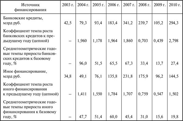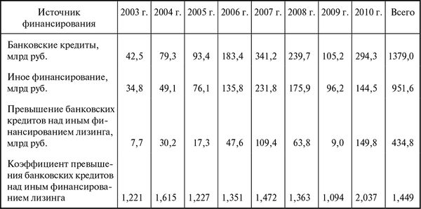 Банковские кредиты и иное финансирование лизинга в 2003–2010 гг.