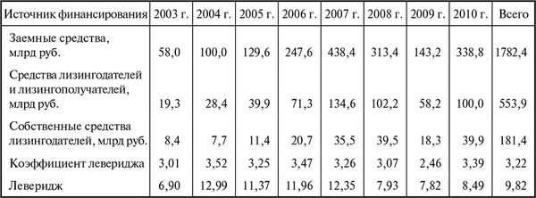 Показатели левериджа на лизинговом рынке России в 2003–2010 гг., млрд руб.