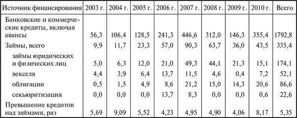 Еще одна пропорция между различными источниками финансирования лизинговых проектов сложилась между кредитами (банковскими и коммерческими поставщиков), с одной стороны, и займами, с другой. Здесь усредненный показатель за восемь лет свидетельствует о том, что опережение первого над вторым превышает пятикратный уровень, причем в 2010 г. оно было более чем восьмикратным. Полагаю, что именно в этом сегменте финансирования лизинга заложены основные резервы привлечения средств для лизинга. Стоит особо выделить эмиссию облигаций и секьюритизацию лизинговых активов, на возможностях использования которых подробно остановимся в следующих главах книги.