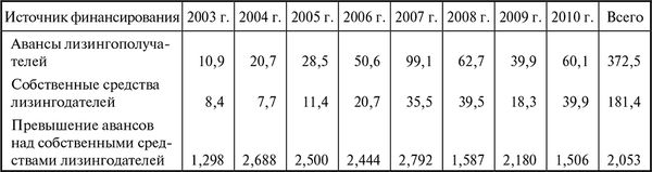В 2009–2010 гг. авансоемкость лизинговых проектов уменьшилась с 19,8 до 13,7 %. В то же время удельный вес собственных средств лизингодателей в общем объеме финансирования оставался неизменным – 9,1 %. В результате почти на треть сократилось превышение авансов над средствами лизингодателей, инвестированных в лизинговые сделки.