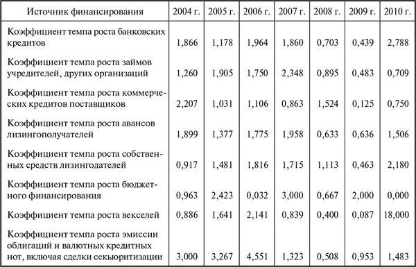 Динамика финансирования лизинга в России по источникам в 2003–2010 гг. (цепные коэффициенты к предыдущему году)