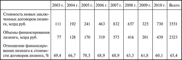 Подведем итог определения финансоемкости лизинга в России с помощью данных табл. 2.15. Расчеты показывают, что сумма финансирования лизинга или первоначальная стоимость лизингового имущества в контрактной стоимости новых договоров лизинга, заключенных в стране в 2003–2010 гг., равняется: