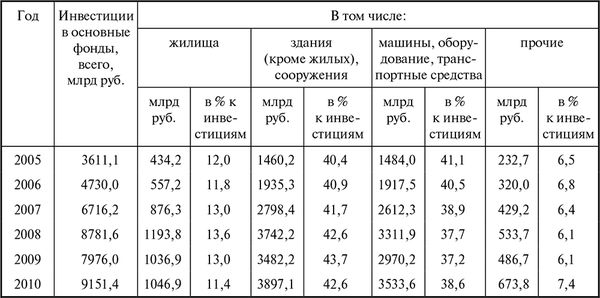Примечания: данные за 1998–1999 гг. по стат. сборнику "Россия в цифрах. 2002" (www.gks.ru); за 2000–2006 гг. по стат. сборнику "Инвестиции в России. 2007", с. 41; за 2007–2009 гг. по стат. сборнику "Россия в цифрах. 2010" (www.gks.ru); за 2010 г. – с сайта Росстата (www.gks.ru).