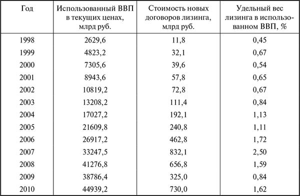 В наилучший для российского лизинга 2007 г. удельный вес лизинга в инвестициях в основной капитал в общем объеме всех инвестиций в основной капитал составлял 8,3 %, а в 2010 г. этот показатель равнялся 6,8 %.